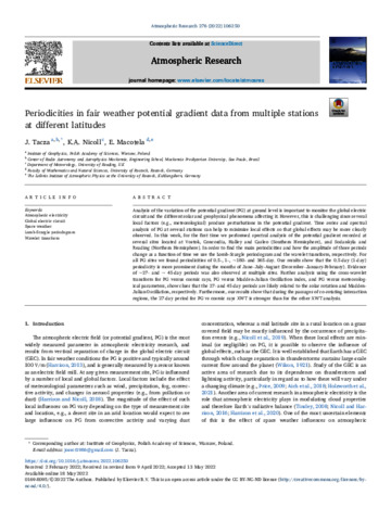 Tacza, J., Nicoll, K. A. orcid id iconORCID: https://orcid.org/0000-0001-5580-6325 and Macotela, E. (2022) Periodicities in fair weather potential gradient data from multiple stations at different latitudes. Atmospheric Research, 276. 106250. ISSN 0169-8059 doi: 10.1016/j.atmosres.2022.106250