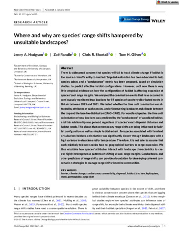 Hodgson, J. A. orcid id iconORCID: https://orcid.org/0000-0003-2297-3631, Randle, Z. orcid id iconORCID: https://orcid.org/0000-0001-9758-1048, Shortall, C. R. orcid id iconORCID: https://orcid.org/0000-0002-7175-5393 and Oliver, T. H. orcid id iconORCID: https://orcid.org/0000-0002-4169-7313 (2022) Where and why are species' range shifts hampered by unsuitable landscapes? Global Change Biology, 28 (16). pp. 4765-4774. ISSN 1354-1013 doi: 10.1111/gcb.16220