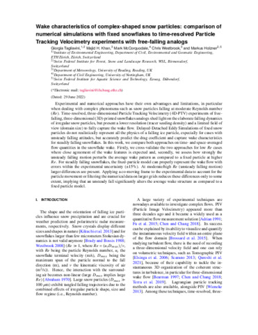 Wake characteristics of complex-shaped snow particles: Comparison of numerical simulations with fixed snowflakes to time-resolved particle tracking velocimetry experiments with free-falling analogs.