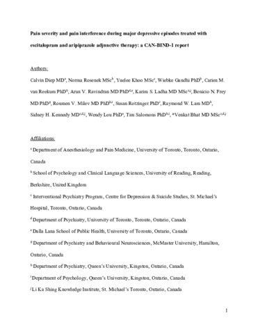 Pain severity and pain interference during major depressive episodes treated with escitalopram and aripiprazole adjunctive therapy: a CAN-BIND-1 report.