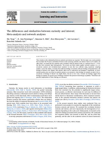 Tang, X., Renninger, K. A., Hidi, S. E., Murayama, K., Lavonen, J. and Salmela-Aro, K. (2022) The differences and similarities between curiosity and interest: meta-analysis and network analyses. Learning and Instruction, 80. 101628. ISSN 0959-4752 doi: 10.1016/j.learninstruc.2022.101628