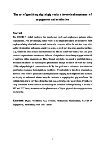 The COVID-19 global pandemic has transformed work and employment patterns within organizations. Two key emerging trends visible at the organization level are as follows. First, employees being asked to leave (which has mostly been seen within the aviation, hospitality, and travel industries) and second, employees asking to work part-time or on a contractual basis (e.g. within the education and healthcare sectors). This so-called ‘new normal’ has also given rise to an unprecedented increase and diffusion of digital workforces being engaged either full or part time within organizations. Thus, through our study, we aimed to contribute from a theoretical standpoint by exploring this phenomenon through the lenses of swift trust theory (STT) and psychological contract theory (PCT). Our goal was to understand how firms use gamification to engage their digital gig workforce. We collected our data from organizations that used some form of gamification in the process of engaging their employees and extended our inquiry to understand whether they did the same in engaging their gig workforces. We restricted our data to only those firms that had engaged white-collar gig workers. Overall, our study contributes to the literature by extending the theoretical debate pertaining to the use of STT and PCT theory to understand the phenomenon of digital gig workforce engagement and productivity.