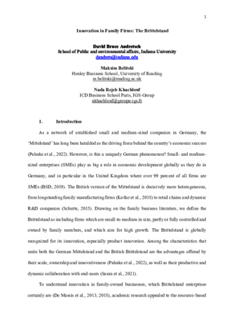 Audretsch, D., Belitski, M. and Rejeb, N. (2013) Innovation in family firms: the Brittelstand. International Journal of Entrepreneurial Behavior & Research, 29 (1). pp. 116-143. ISSN 1355-2554 doi: 10.1108/IJEBR-12-2021-1016