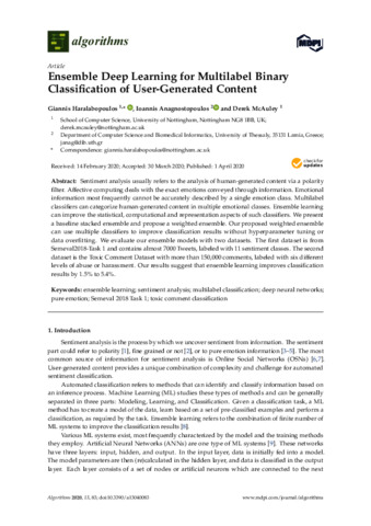 Haralabopoulos, G., Anagnostopoulos, I. and McAuley, D. (2020) Ensemble deep learning for multilabel binary classification of user-generated content. Algorithms, 13 (4). 83. ISSN 1999-4893 doi: 10.3390/a13040083