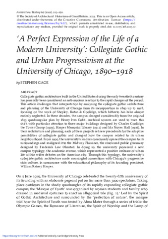 Gage, S. orcid id iconORCID: https://orcid.org/0000-0001-7399-995X (2023) 'A perfect expression of the life of a modern university': collegiate gothic and urban progressivism at the University of Chicago, 1890–1918. Architectural History, 66. pp. 213-250. ISSN 2059-5670 doi: 10.1017/arh.2023.10