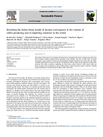Kadigi, R. M. J., Robinson, E., Szabo, S., Kangile, J., Mgeni, C. P., De Maria, M. orcid id iconORCID: https://orcid.org/0000-0003-1969-0251, Tsusaka, T. and Nhau, B. (2022) Revisiting the Solow-Swan model of income convergence in the context of coffee producing and re-exporting countries in the world. Sustainable Futures, 4. 100082. ISSN 26661888 doi: 10.1016/j.sftr.2022.100082