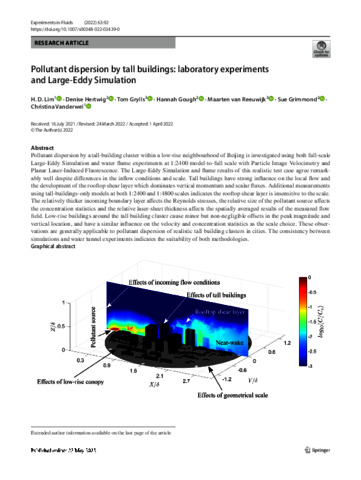 Lim, H. D. orcid id iconORCID: https://orcid.org/0000-0001-6191-6803, Hertwig, D. orcid id iconORCID: https://orcid.org/0000-0002-2483-2675, Grylls, T. orcid id iconORCID: https://orcid.org/0000-0002-0948-4932, Gough, H. orcid id iconORCID: https://orcid.org/0000-0002-4693-5931, Reeuwijk, M. v. orcid id iconORCID: https://orcid.org/0000-0003-4840-5050, Grimmond, S. orcid id iconORCID: https://orcid.org/0000-0002-3166-9415 and Vanderwel, C. orcid id iconORCID: https://orcid.org/0000-0002-5114-8377 (2022) Pollutant dispersion by tall buildings: laboratory experiments and Large-Eddy Simulation. Experiments in Fluids, 63 (6). 92. ISSN 0723-4864 doi: 10.1007/s00348-022-03439-0