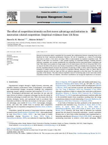 Research in innovation-related coopetition has documented that collaboration between competing firms can be beneficial for firms’ innovation performance. However, the role of coopetition as a means of accelerating innovation to achieve a first mover advantage (FMA) is underexplored in empirical coopetition work. The purpose of this study is to introduce a more granular typology of coopetition strategies, including balanced moderate coopetition, and examine quantitatively the relationship between innovation-related coopetition and firms’ FMA. Based on an analysis of a large sample of 21,140 observations in the UK over the period 2002-2014, we measure the effect of the presence and intensity of coopetition on FMA and imitation from competitors. We find that the coopetition intensity decreases the propensity of achieving an FMA as well as radical innovation, while propensity to imitate increases with an increase in coopetition intensity. Moreover, there is a linear effect of coopetition intensity on the one hand and FMA and imitation propensity on the other hand. The results hold regardless of the industry. This study informs coopetition research by shedding light on how innovation-related coopetition influence FMA and imitation. Theoretical contributions and managerial implications are discussed.