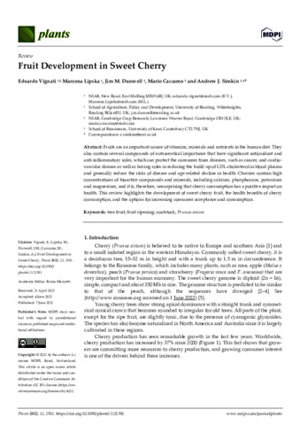 Vignati, E., Lipska, M., Dunwell, J. M. orcid id iconORCID: https://orcid.org/0000-0003-2147-665X, Caccamo, M. and Simkin, A. J. (2022) Fruit development in sweet cherry. Plants, 11 (12). 1531. ISSN 2223-7747 doi: 10.3390/plants11121531