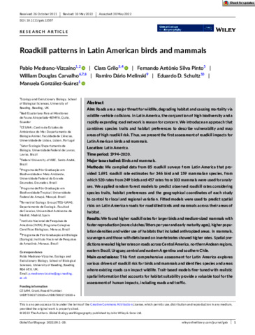 Aim Roads are a major threat for wildlife, degrading habitat and causing mortality via wildlife-vehicle collisions. In Latin America, the conjunction of high biodiversity and a rapidly expanding road network is reason for concern. We introduce an approach that combines species traits and habitat preferences to describe vulnerability and map high roadkill risk areas. Thus, we present the first assessment of roadkill impacts for Latin American birds and mammals. Location Latin America. Time period 1994–2020. Major taxa studied Birds and mammals. Methods We compiled data from 85 roadkill surveys from Latin America that provided 1691 roadkill rate estimates for 346 bird and 159 mammalian species, from which, 520 rates from 249 birds and 457 rates from 103 mammals were used for analyses. We applied Random Forest models to predict observed roadkill rates considering species’ traits, habitat preferences, and the geographic coordinates of each study to control for local and regional variation. Fitted models were used to predict spatial risks in Latin American roads for roadkilled birds and mammals across their areas of habitat. Results We found higher roadkill rates in larger birds and medium-sized mammals with faster reproduction (more clutches/litters per year and early maturity ages), higher population densities, and wider use of habitats that included anthropized areas. In mammals, scavengers and those with diets based on invertebrates showed higher rates. Spatial predictions revealed higher rates in roads across Central America, northern Andean regions, eastern Brazil, Uruguay, central-eastern Argentina, and southern Chile. Main conclusions This first comprehensive assessment for Latin America explores various drivers of roadkill risk for birds and mammals and identifies species and areas where existing roads can impact wildlife. Trait-based models fine-tuned with realistic spatial information that accounts for habitat suitability provide a valuable tool for the assessment of human impacts including roads and traffic.
