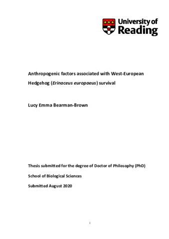 Bearman-Brown, L. E. (2021) Anthropogenic factors associated with West-European Hedgehog (Erinaceus europaeus) survival. PhD thesis, University of Reading. doi: 10.48683/1926.00105588