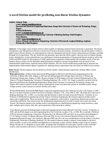 Nnaji, A. C., Holderbaum, W. orcid id iconORCID: https://orcid.org/0000-0002-1677-9624 and Becerra, V. (2022) A novel friction model for predicting nonlinear friction dynamics. International Journal of Modelling, Identification and Control, 38 (2). pp. 105-120. ISSN 1746-6180