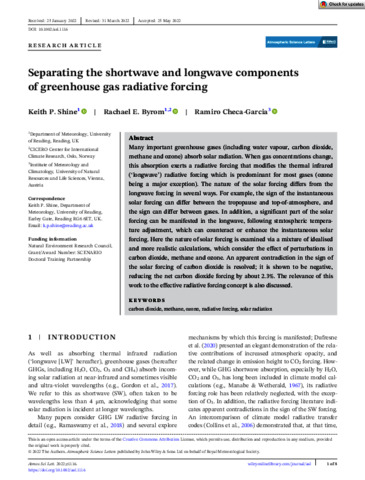 Shine, K. P. orcid id iconORCID: https://orcid.org/0000-0003-2672-9978, Byrom, R. E. orcid id iconORCID: https://orcid.org/0000-0002-5992-6962 and Checa‐Garcia, R. orcid id iconORCID: https://orcid.org/0000-0001-7653-3653 (2022) Separating the shortwave and longwave components of greenhouse gas radiative forcing. Atmospheric Science Letters, 23 (10). e1116. ISSN 1530-261X doi: 10.1002/asl.1116