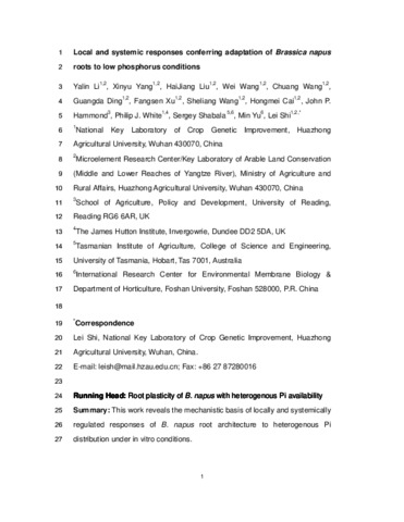 Local and systemic responses conferring acclimation of Brassica napus roots to low phosphorus conditions.