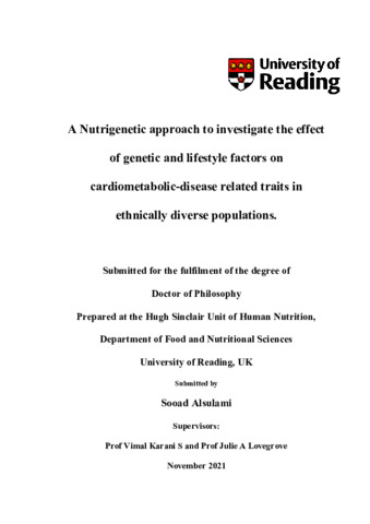 Alsulami, S. (2021) A Nutrigenetic approach to investigate the effect of genetic and lifestyle factors on cardiometabolic-disease related traits in ethnically diverse populations. PhD thesis, University of Reading. doi: 10.48683/1926.00105704