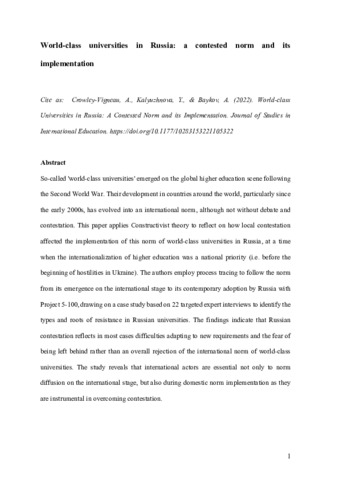 So-called 'world-class universities' emerged on the global higher education scene following the Second World War. Their development in countries around the world, particularly since the early 2000s, has evolved into an international norm, although not without debate and contestation. This paper applies Constructivist theory to reflect on how local contestation affected the implementation of this norm of world-class universities in Russia, at a time when the internationalization of higher education was a national priority (i.e. before the beginning of hostilities in Ukraine). The authors employ process tracing to follow the norm from its emergence on the international stage to its contemporary adoption by Russia with Project 5-100, drawing on a case study based on 22 targeted expert interviews to identify the types and roots of resistance in Russian universities. The findings indicate that Russian contestation reflects in most cases difficulties adapting to new requirements and the fear of being left behind rather than an overall rejection of the international norm of world-class universities. The study reveals that international actors are essential not only to norm diffusion on the international stage, but also during domestic norm implementation as they are instrumental in overcoming contestation.