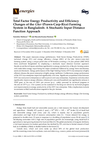 Rahman, S. orcid id iconORCID: https://orcid.org/0000-0002-0391-6191 and Barmon, B. K. (2018) Total Factor Energy Productivity and efficiency changes of the gher (prawn-carp-rice) farming system in Bangladesh: a stochastic input distance function approach. Energies, 11 (12). 3482. ISSN 1996-1073 doi: 10.3390/en11123482