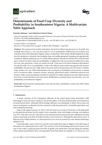 Rahman, S. orcid id iconORCID: https://orcid.org/0000-0002-0391-6191 and Chima, C. (2016) Determinants of food crop diversity and profitability in southeastern Nigeria: a multivariate tobit approach. Agriculture Ecosystems & Environment, 6 (2). 14. ISSN 0167-8809 doi: 10.3390/agriculture6020014