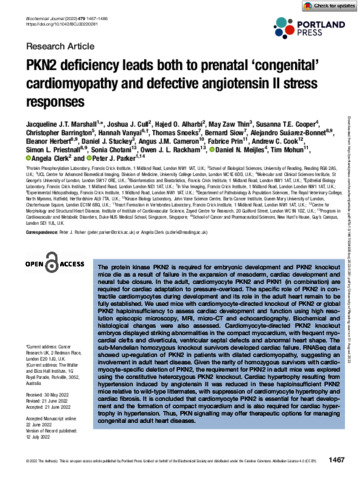 Marshall, J. J. T., Cull, J. J., Alharbi, H. O., Zaw Thin, M., Cooper, S. T. E., Barrington, C., Vanyai, H., Snoeks, T., Siow, B., Suáarez-Bonnet, A., Herbert, E., Stuckey, D. J., Cameron, A. J. M., Prin, F., Cook, A. C., Priestnall, S. L., Chotani, S., Rackham, O. J. L., Meijles, D. N., Mohun, T., Clerk, A. orcid id iconORCID: https://orcid.org/0000-0002-5658-0708 and Parker, P. J. (2022) PKN2 deficiency leads both to prenatal congenital cardiomyopathy and defective angiotensin II stress responses. Biochemical Journal, 479 (13). pp. 1467-1486. ISSN 1470-8728 doi: 10.1042/BCJ20220281