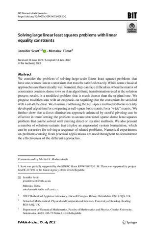 Scott, J. orcid id iconORCID: https://orcid.org/0000-0003-2130-1091 and Tůma, M. (2022) Solving large linear least squares problems with linear equality constraints. BIT Numerical Mathematics, 62. pp. 1765-1787. ISSN 1572-9125 doi: 10.1007/s10543-022-00930-2