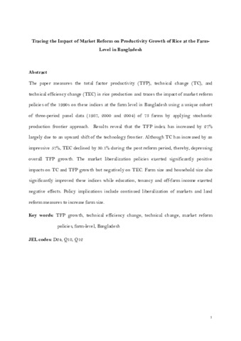 The paper measures the total factor productivity (TFP), technical change (TC) and technical efficiency change (TEC) in rice production, and traces the impact of market reform policies of the 1990s on these indices at the farm level in Bangladesh using a unique cohort of three-period panel data (1987, 2000 and 2004) of 73 farms by applying stochastic production frontier approach. Results reveal that the TFP index has increased by 27% largely due to an upward shift of the technology frontier. Although TC has increased by an impressive 57%, TEC declined by 30.1% during the post-reform period, thereby depressing overall TFP growth. The market liberalization policies exerted significantly positive impacts on TC and TFP growth but negatively on TEC. Farm size and household size also significantly improved these indices while education, tenancy and off-farm income exerted negative effects. Policy implications include continued liberalization of markets and land reform measures to increase farm size.