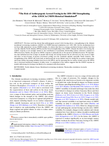 Robson, J. orcid id iconORCID: https://orcid.org/0000-0002-3467-018X, Menary, M. B., Sutton, R. T. orcid id iconORCID: https://orcid.org/0000-0001-8345-8583, Mecking, J., Gregory, J. M. orcid id iconORCID: https://orcid.org/0000-0003-1296-8644, Jones, C., Sinha, B., Stevens, D. P. and Wilcox, L. J. orcid id iconORCID: https://orcid.org/0000-0001-5691-1493 (2022) The role of anthropogenic aerosol forcing in the 1850-1985 strengthening of the AMOC in CMIP6 historical simulations. Journal of Climate, 35 (20). pp. 3243-3263. ISSN 1520-0442 doi: 10.1175/JCLI-D-22-0124.1
