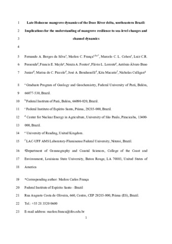 Late Holocene mangrove dynamics of the Doce River delta, southeastern Brazil: implications for the understanding of mangrove resilience to sea-level changes and channel dynamics.