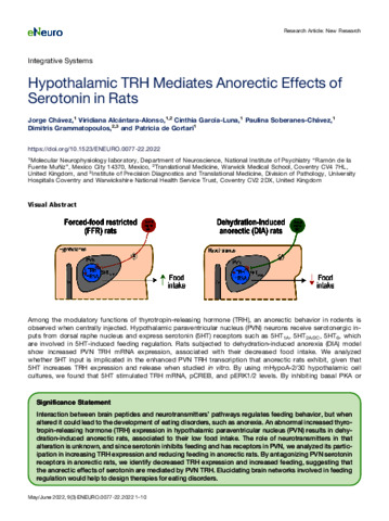 Among the modulatory functions of thyrotropin-releasing hormone (TRH), an anorectic behavior in rodents is observed when centrally injected. Hypothalamic paraventricular nucleus (PVN) neurons receive serotonergic inputs from dorsal raphe nucleus and express serotonin (5HT) receptors such as 5HT1A, 5HT2A/2C, 5HT6, which are involved in 5HT-induced feeding regulation. Rats subjected to dehydration-induced anorexia (DIA) model show increased PVN TRH mRNA expression, associated with their decreased food intake. We analyzed whether 5HT input is implicated in the enhanced PVN TRH transcription that anorectic rats exhibit, given that 5HT increases TRH expression and release when studied in vitro. By using mHypoA-2/30 hypothalamic cell cultures, we found that 5HT stimulated TRH mRNA, pCREB, and pERK1/2 levels. By inhibiting basal PKA or PKC activities or those induced by 5HT, pCREB or pERK1/2 content did not increase suggesting involvement of both kinases in their phosphorylation. 5HT effect on TRH mRNA was not affected by PKA inhibition, but it diminished in the presence of PKCi suggesting involvement of PKC in 5HT-induced TRH increased transcription. This likely involves 5HT2A/2C and the activation of alternative transduction pathways than those studied here. In agreement with the in vitro data, we found that injecting 5HT2A/2C antagonists into the PVN of DIA rats reversed the increased TRH expression of anorectic animals, as well as their decreased food intake; also, the agonist reduced food intake of hungry restricted animals along with elevated PVN TRH mRNA levels. Our results support that the anorectic effects of serotonin are mediated by PVN TRH in this model.