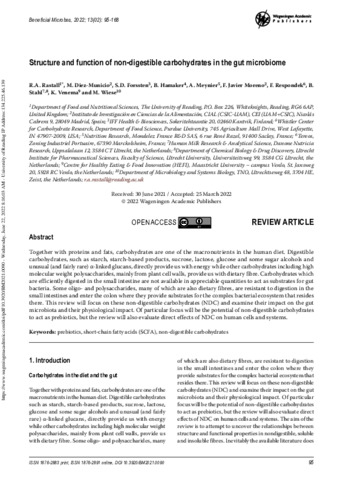 Rastall, R. A., Diez-Municio, M., Forssten, S. D., Hamaker, B., Meynier, A., Moreno, F. J., Respondek, F., Stahl, B., Venema, K. and Wiese, M. (2022) Structure and function of non-digestible carbohydrates in the gut microbiome. Beneficial Microbes, 13 (2). pp. 95-168. ISSN 1876-2883 doi: 10.3920/BM2021.0090