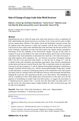 Owens, M. J. orcid id iconORCID: https://orcid.org/0000-0003-2061-2453, Chakraborty, N. orcid id iconORCID: https://orcid.org/0000-0002-3134-1946, Turner, H., Lang, M. orcid id iconORCID: https://orcid.org/0000-0002-1904-3700, Riley, P. orcid id iconORCID: https://orcid.org/0000-0002-1859-456X, Lockwood, M. orcid id iconORCID: https://orcid.org/0000-0002-7397-2172, Barnard, L. A. orcid id iconORCID: https://orcid.org/0000-0001-9876-4612 and Chi, Y. orcid id iconORCID: https://orcid.org/0000-0001-9315-4487 (2022) Rate of change of large-scale solar-wind structure. Solar Physics, 297 (7). 83. ISSN 0038-0938 doi: 10.1007/s11207-022-02006-4