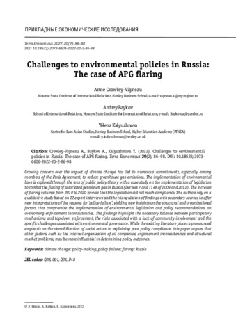 Crowley-Vigneau, A., Baykov, A. and Kalyuzhnova, Y. orcid id iconORCID: https://orcid.org/0000-0002-5781-8837 (2022) Challenges to environmental policies in Russia: the case of APG flaring. Terra Economicus, 20 (2). pp. 86-98. ISSN 2410-4531 doi: 10.18522/2073-6606-2022-20-2-86-98