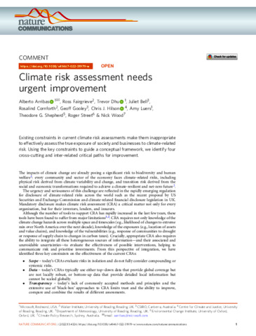 Arribas, A., Fairgrieve, R., Dhu, T., Bell, J., Cornforth, R. orcid id iconORCID: https://orcid.org/0000-0003-4379-9556, Gooley, G., Hilson, C. J. orcid id iconORCID: https://orcid.org/0000-0003-4114-6471, Luers, A., Shepherd, T. G. orcid id iconORCID: https://orcid.org/0000-0002-6631-9968, Street, R. and Wood, N. (2022) Climate risk assessment needs urgent improvement. Nature Communications, 13. 4326. ISSN 2041-1723 doi: 10.1038/s41467-022-31979-w