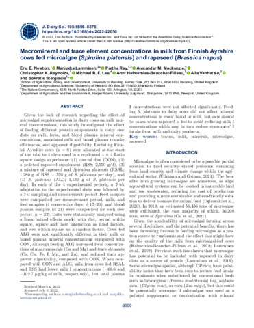 Macromineral and trace element concentrations in milk from Finnish Ayrshire cows fed microalgae (Spirulina platensis) and rapeseed (Brassica napus).