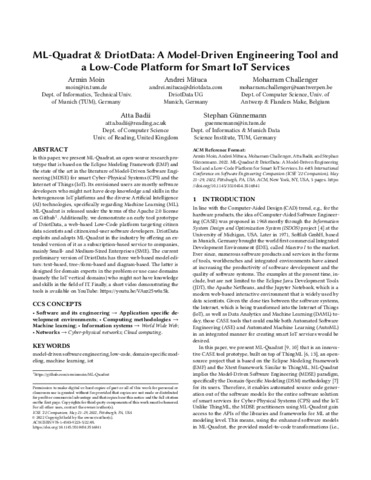 Moin, A., Mituca, A., Challenger, M., Badii, A. and Günnemann, S. (2022) ML-Quadrat & DriotData: a model-driven engineering tool and a low-code platform for smart IoT services. In: 2022 IEEE/ACM 44th International Conference on Software Engineering, 22-24 May 2022, Pittsburgh, PA, USA, pp. 144-148. doi: 10.1109/ICSE-Companion55297.2022.9793752