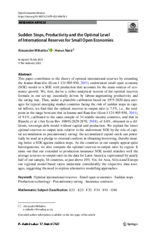 Sudden stops, productivity and the optimal level of international reserves for small open economies.