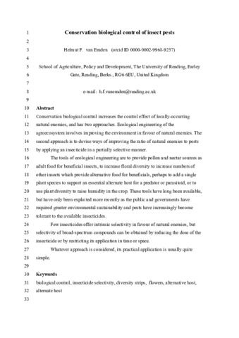 3. Gurr GM, van Emden HF, Wratten SD. Habitat manipulation and natural enemy efficiency: implications for the control of pests. In: Barbosa P, editor. Conservation Biological Control. San Diego (Ca), USA: Academic Press; 1998, p. 155–83.