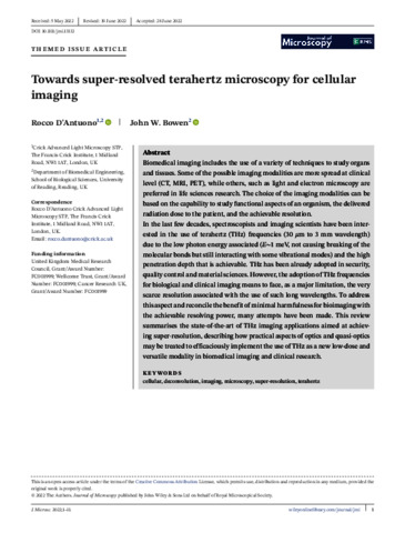 D'Antuono, R. orcid id iconORCID: https://orcid.org/0000-0003-0180-6500 and Bowen, J. W. orcid id iconORCID: https://orcid.org/0000-0003-2590-3399 (2022) Towards super‐resolved terahertz microscopy for cellular imaging. Journal of Microscopy. ISSN 1365-2818 doi: 10.1111/jmi.13132