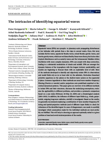 Knippertz, P., Gehne, M., Kiladis, G. N., Kikuchi, K., Satheesh, A. R., Roundy, P. E., Yang, G.-Y. orcid id iconORCID: https://orcid.org/0000-0001-7450-3477, Žagar, N., Dias, J., Fink, A. H., Methven, J. orcid id iconORCID: https://orcid.org/0000-0002-7636-6872, Schlueter, A., Sielmann, F. and Wheeler, M. C. (2022) The intricacies of identifying equatorial waves. Quarterly Journal of the Royal Meteorological Society, 148 (747). pp. 2814-2852. ISSN 1477-870X doi: 10.1002/qj.4338