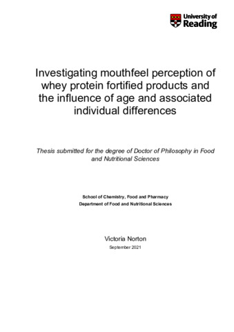Norton, V. orcid id iconORCID: https://orcid.org/0000-0002-1961-2539 (2022) Investigating mouthfeel perception of whey protein fortified products and the influence of age and associated individual differences. PhD thesis, University of Reading. doi: 10.48683/1926.00106393