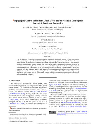 Topographic control of Southern Ocean gyres and the Antarctic Circumpolar Current: a barotropic perspective.