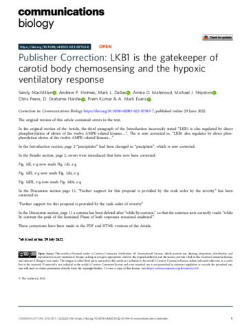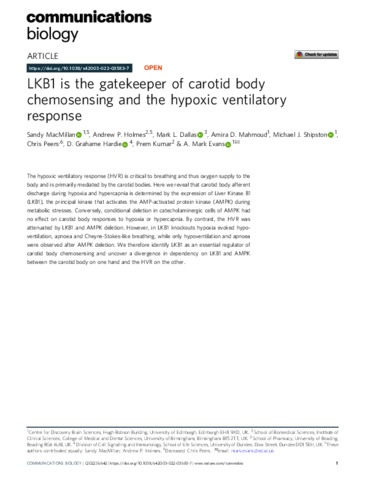 MacMillan, S., Holmes, A. P., Dallas, M. L. orcid id iconORCID: https://orcid.org/0000-0002-5190-0522, Mahmoud, A. D., Shipston, M. J., Peers, C., Hardie, D. G., Kumar, P. and Evans, A. M. (2022) LKB1 is the gatekeeper of carotid body chemosensing and the hypoxic ventilatory response. Communications Biology, 5. 642. ISSN 2399-3642 doi: 10.1038/s42003-022-03583-7