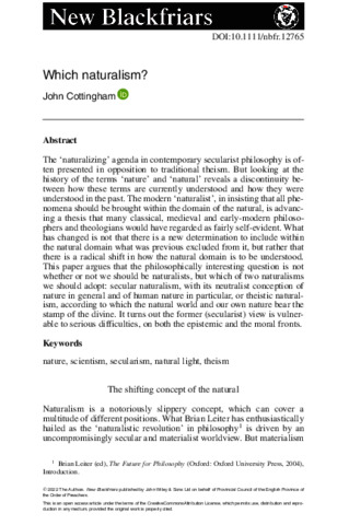 Cottingham, J. orcid id iconORCID: https://orcid.org/0000-0001-5205-0323 (2022) Which naturalism? New Blackfriars, 103 (107). pp. 581-596. ISSN 0028-4289 doi: 10.1111/nbfr.12765