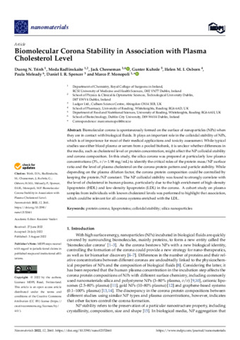 Trinh, D. N., Radlinskaite, M., Cheeseman, J., Kuhnle, G. orcid id iconORCID: https://orcid.org/0000-0002-8081-8931, Osborn, H. M. I. orcid id iconORCID: https://orcid.org/0000-0002-0683-0457, Meleady, P., Spencer, D. I. R. and Monopoli, M. P. (2022) Biomolecular corona stability in association with plasma cholesterol level. Nanomaterials, 12 (15). 2661. ISSN 2079-4991 doi: 10.3390/nano12152661