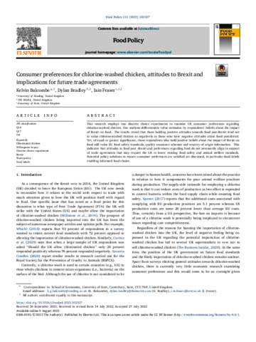 Balcombe, K., Bradley, D. and Fraser, I. (2022) Consumer preferences for chlorine-washed chicken, attitudes to Brexit and implications for future trade agreements. Food Policy, 111. 102327. ISSN 0306-9192 doi: 10.1016/j.foodpol.2022.102327