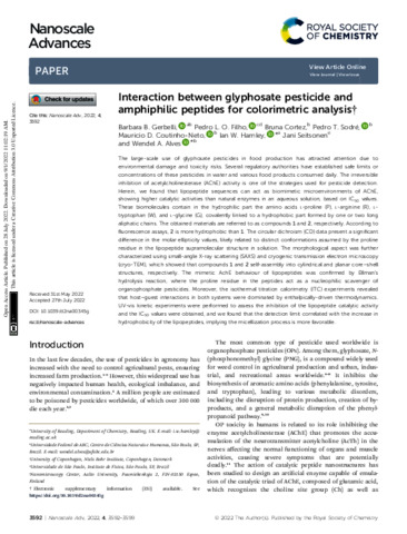 Interaction between glyphosate pesticide and amphiphilic peptides for colorimetric analysis.