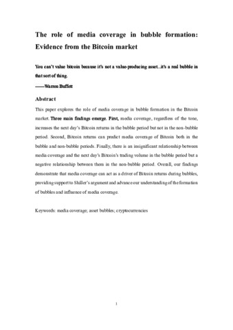 This paper explores the role of media coverage in bubble formation in the Bitcoin market. Three main findings emerge. First, media coverage, regardless of the tone, increases the next day’s Bitcoin returns in the bubble period but not in the non-bubble period. Second, the Bitcoin returns can predict media coverage of Bitcoin both in the bubble and non-bubble periods. Finally, there is an insignificant relationship between media coverage and the next day’s Bitcoin’s trading volume in the bubble period but a negative relationship between them in the non-bubble period. Overall, our findings demonstrate that media coverage can act as a driver of Bitcoin returns during bubbles, providing support to Shiller’s argument and advancing understandings of the formation of bubbles and influences of media coverage.