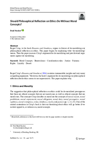 Hooker, B. (2022) Should philosophical reflection on ethics do without moral concepts? Ethical Theory and Moral Practice, 16. ISSN 1572-8447 doi: 10.1007/s10677-022-10303-x