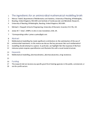 Tindall, M., Chappell, M. J. and Yates, J. W. T. (2022) The ingredients for an antimicrobial mathematical modelling broth. International Journal of Antimicrobial Agents, 60 (4). 106641. ISSN 0924-8579 doi: 10.1016/j.ijantimicag.2022.106641