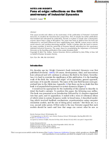 This paper records and reflects on the anniversary of the publication of Forrester’s Industrial Dynamics. It considers the book from four perspectives. First, it samples the earlier publications that heralded and anticipated its publication. Second, it explores in depth some contemporary reviews, drawn from a range of disciplines. The paper then looks in detail at how the book was influenced by, and itself influenced, three neighbouring areas: MS/OR, system science and the social sciences, and ‘problem structuring methods’. Forth, to further place the book in context, the paper considers in brief the varied life of Forrester himself, indicating how his experiences informed Industrial Dynamics. The paper closes by recapitulating the importance of Industrial Dynamics as the founding publication of the system dynamics field.