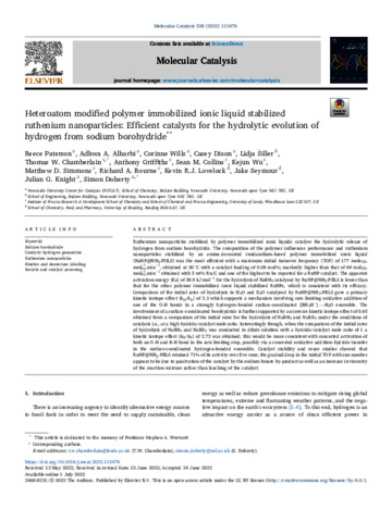 Ruthenium nanoparticles stabilised by polymer immobilized ionic liquids catalyse the hydrolytic release of hydrogen from sodium borohydride. The composition of the polymer influences performance and ruthenium nanoparticles stabilised by an amine-decorated imidazolium-based polymer immobilised ionic liquid (RuNP@NH2-PIILS) was the most efficient with a maximum initial turnover frequency (TOF) of 177 moleH2.molRu−1.min−1, obtained at 30°C with a catalyst loading of 0.08 mol%; markedly higher than that of 69 molH2.molRu−1.min−1 obtained with 5 wt% Ru/C and one of the highest to be reported for a RuNP catalyst. The apparent activation energy (Ea) of 38.9 kJ mol−1 for the hydrolysis of NaBH4 catalysed by RuNP@NH2-PIILS is lower than that for the other polymer immobilized ionic liquid stabilised RuNPs, which is consistent with its efficacy. Comparison of the initial rates of hydrolysis in H2O and D2O catalysed by RuNP@NH2-PIILS gave a primary kinetic isotope effect (kH/kD) of 2.3 which supports a mechanism involving rate limiting oxidative addition of one of the O-H bonds in a strongly hydrogen-bonded surface-coordinated [BH3H−]—-H2O ensemble. The involvement of a surface-coordinated borohydride is further supported by an inverse kinetic isotope effect of 0.65 obtained from a comparison of the initial rates for the hydrolysis of NaBH4 and NaBD4 under the conditions of catalysis i.e., at a high hydride/catalyst mole ratio. Interestingly though, when the comparison of the initial rates of hydrolysis of NaBH4 and NaBD4 was conducted in dilute solution with a hydride/catalyst mole ratio of 1 a kinetic isotope effect (kH/kD) of 2.72 was obtained; this would be more consistent with concerted activation of both an O-H and B-H bond in the rate limiting step, possibly via a concerted oxidative addition-hydride transfer in the surface-coordinated hydrogen-bonded ensemble. Catalyst stability and reuse studies showed that RuNP@NH2-PIILS retained 71% of its activity over five runs; the gradual drop in the initial TOF with run number appears to be due to passivation of the catalyst by the sodium borate by-product as well as an increase in viscosity of the reaction mixture rather than leaching of the catalyst.